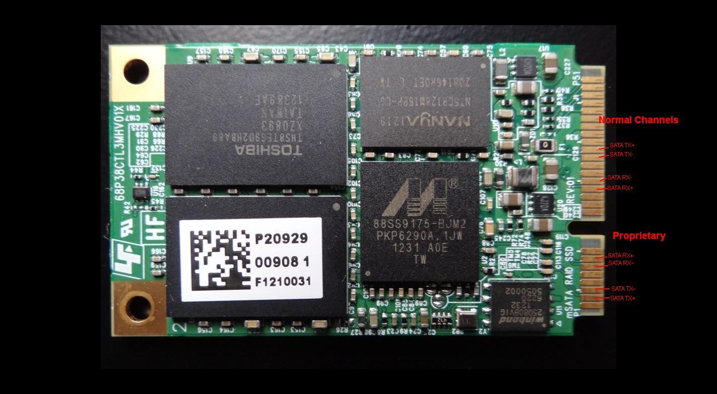 - Read the first SSD using a standard mSATA adapter, then manually solder in wires to move the second SATA channel to where the first belongs. Then reconstruct the RAID from the two SSD images (not for the faint of heart)