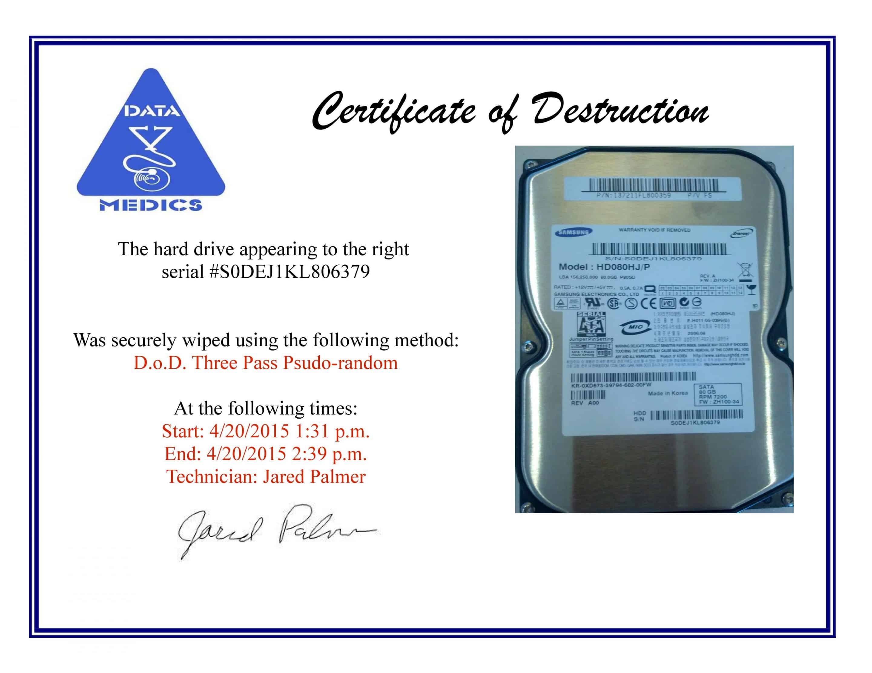 While the specific wiping method used will vary depending on the HDD or media type, all drives are wiped using a method which guarantees the data can never be recovered by any present or future data recovery technology.